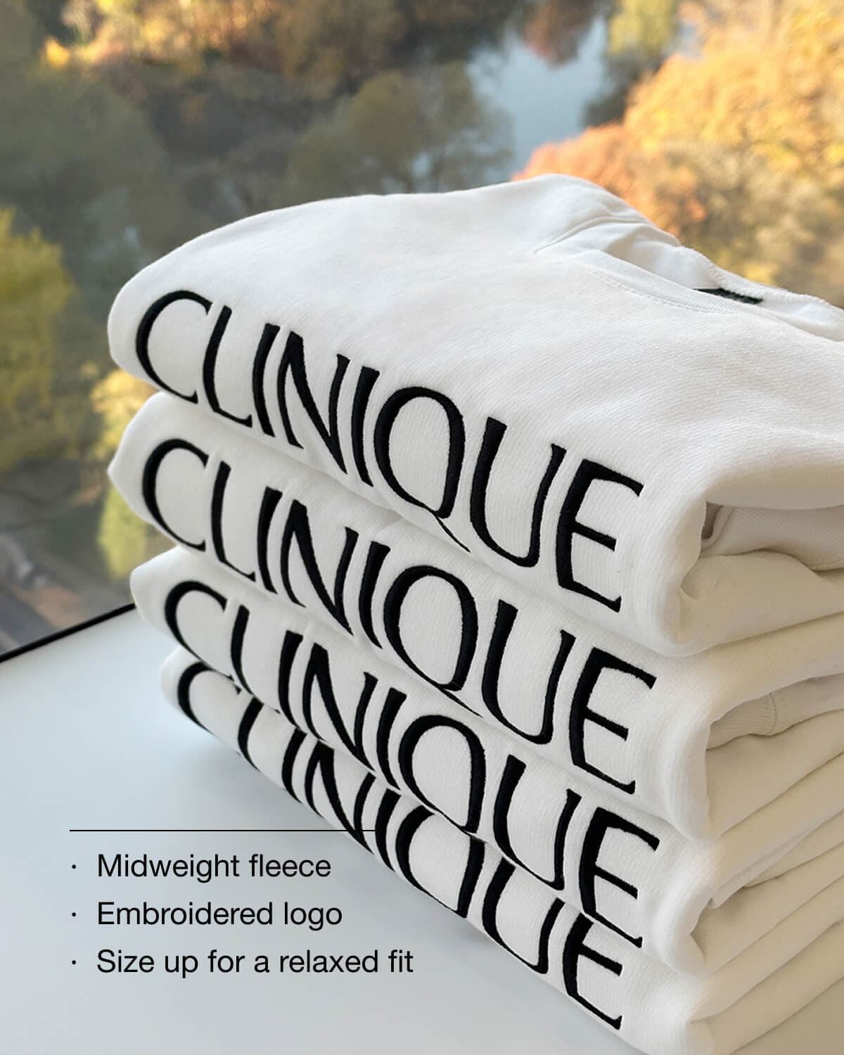 A cozy way to wear Clinique. White crewneck sweatshirt has a black embroidered logo.