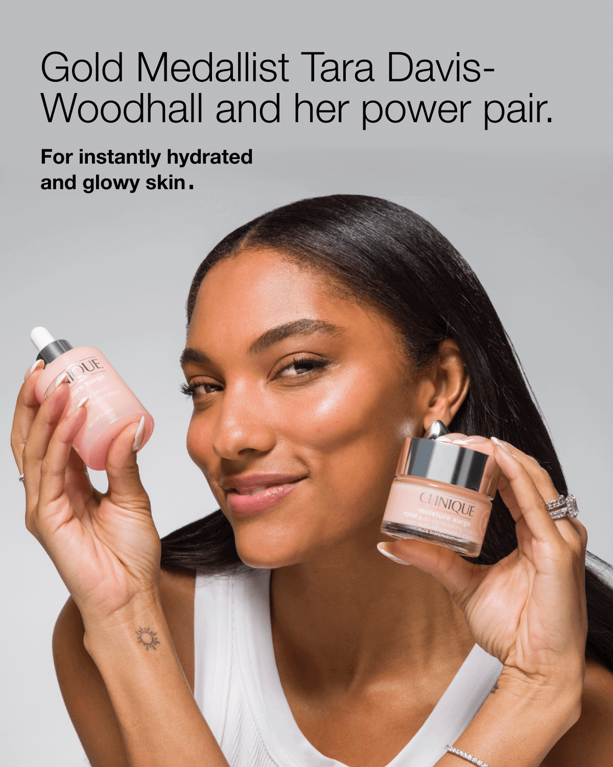 Gold Medalist Tara Davis-Woodhall’s ultimate power pair for unstoppable glow and dewy skin. This high-performance glow skin set features the first-ever Moisture Surge Glow Serum—clinically proven to gently exfoliate, hydrate, and visibly brighten—paired with our most-loved lightweight gel moisturizer to flood skin with instant and long-lasting moisture. Together, this glow serum and hydrator deliver immediate radiance, dewy skin, and a continuous glow that goes the distance.